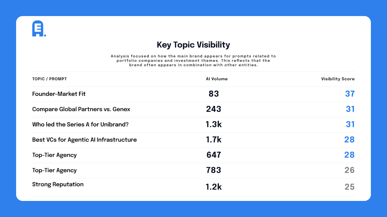 We look at the prompt topics a brand already appears for and measure visibility per topic. A prompt topic might be something like “best Webflow agency for B2B SaaS,” “top early-stage fintech investors,” or “enterprise endpoint security platforms.” Each topic receives a visibility index based primarily on how frequently the brand is mentioned within AI-generated answers tied to that theme.